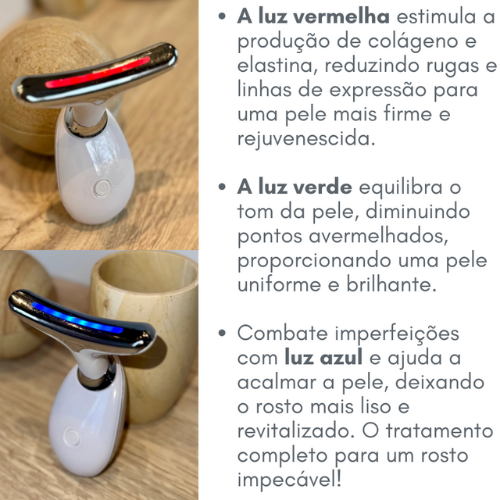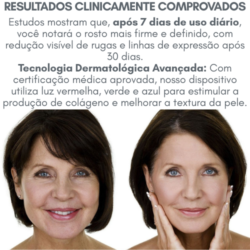 Utilize o Face Glow 2.0®: Deslize o Face Glow 2.0®. Use 3 luzes (Vermelha, verde e azul) dos acordos necessários: Vermelho para estimular, verde para padronizar e azul para combater as imperfeições. Passe cerca de 2 minutos em cada área do rosto e pescoço, obtendo cobertura total em apenas 10 minutos por dia.